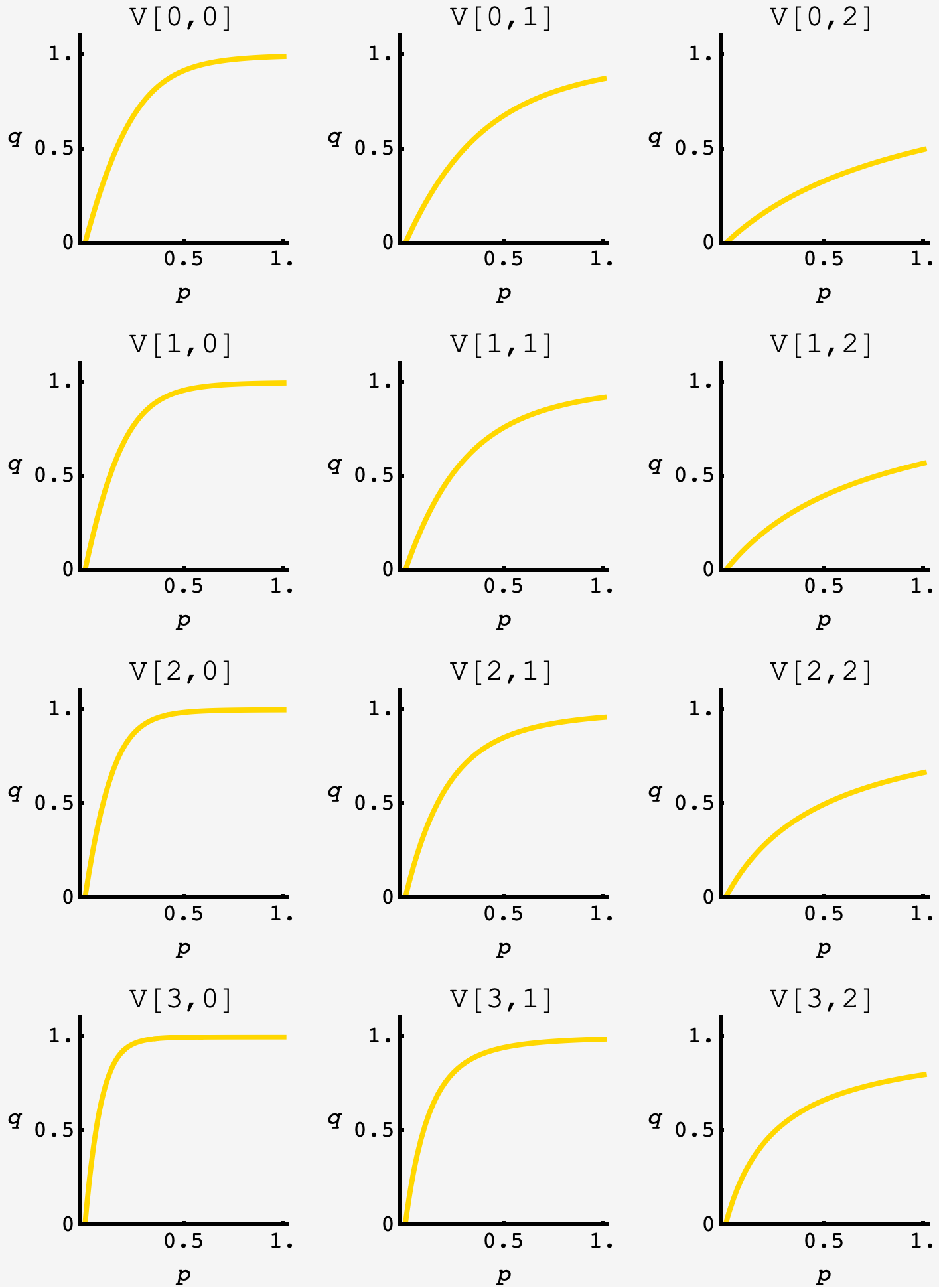 plotting this, we can see how the expected value to the batter evolves in each count (equivalently, the negative value to the pitcher). as we move from $(0,0)$ to $1, 2$ and $3$ balls, the batter becomes near certain to get $1$ for all $p \gtrapprox 0.4.$ likewise, as we add strikes, the curve bends down quite a bit, so that an $(0,2)$ count has a max of $1/2$ when $p=1.$