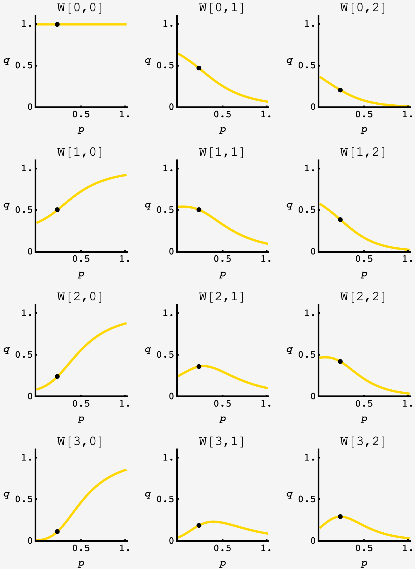 now, the players will adjust to any value of $p$ according to the decision rules above in order to pursue their own optimal outcomes. it’s only the league office that cares about full counts and can set $p$. plotting $W(3,2)$ (bottom right corner of diagram) we see the optimum is around $p \approx 22\%,$ indicated by the black dot in each plot. binary searching for the maximum, we find that full counts will happen in a fraction $q_\text{opt} \approx 0.295967993374272054854169869096$ of all at bats given that the league sets $p_\text{opt} \approx 0.226973232538510017721759332456$