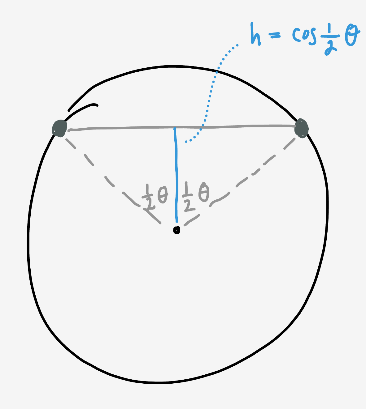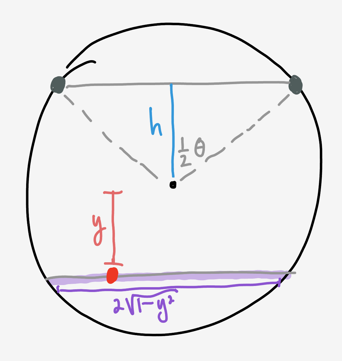 \[\begin{align} \langle d_h\rangle &= \int_{-1}^1 \text{d}y\, p_y \lvert y-h\rvert \\ &= \frac{2}{\pi} \int_h^1 \text{d}y\, \sqrt{1-y^2}(y-h) + \frac{2}{\pi} \int_{-1}^h \text{d}y\, \sqrt{1-y^2} (h-y) \\ &= \frac{2}{\pi}\left[\frac{1}{3} \sqrt{1-h^2} \left(h^2+2\right)+h \sin ^{-1}h\right] \end{align}\]Plugging in $h = \cos\frac12\theta,$ we can average over $\theta$ to get the unqualified expected tree to hose distance: