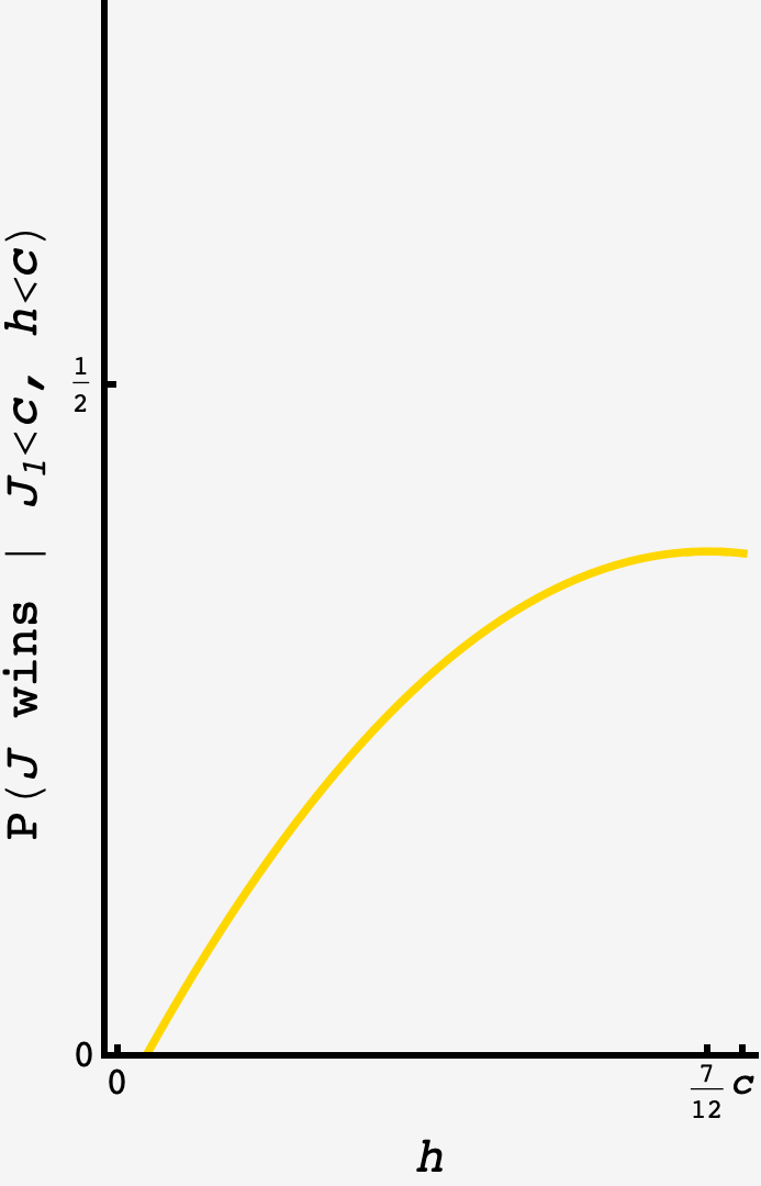 \[h = \frac12\frac{1+t_- +t_-^2}{1+t_-} = \frac{7}{12}.\]Plugging this back in, we get $P(J\,\text{wins}, J_1 < c) = \frac{193\sqrt{5}-287}{384} \approx 37.65\%.$ Putting it all together, the probability that $J$ wins under optimal play is