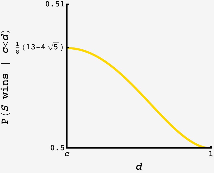 \[\begin{align} P(J\,\text{wins}) &= (1-c)P(J\,\text{wins} | c < J_1) + cP(J\,\text{wins}|J_1 < c) \\ &= \frac{1}{192} \left(229 - 60 \sqrt{5}\right) \\ &\approx 49.3937090364649\%, \end{align}\]which closes the gap from $100\%-50.70\% = 49.30\%$ by a full $9/100^\text{th}$s of a percent!
