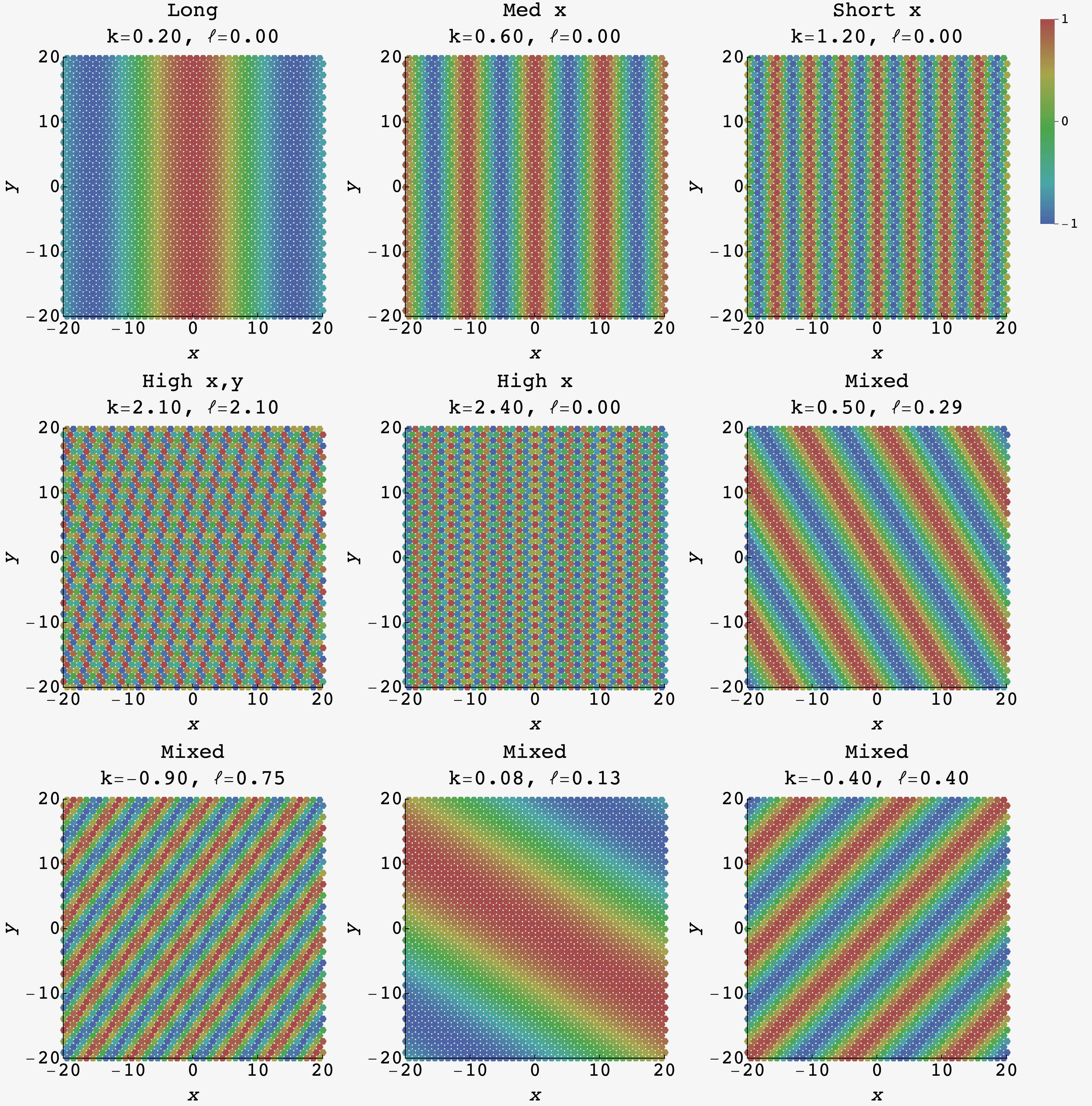 Now, the static patterns are two dimensional so we need two wave numbers, $k$ and $\ell,$ instead of one. This means that each spatial dimension gets its own wave number/transform variable. The corresponding mode is $e^{ikx}e^{i\ell y},$ and the Fourier coefficients $\widetilde{\omega}_t(k,\ell)$ tell us how much the $(k,\ell)$ pattern contributes to the probability distribution.