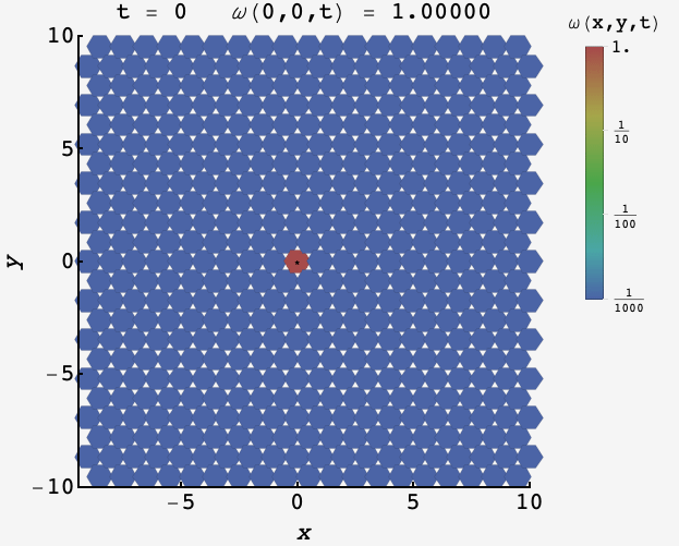 \[\omega_t(x,y) \approx \frac{\sqrt{3}}{2}\dfrac{e^{-(x^2+y^2)/t}}{\pi t}.\]Watching the distribution over time, the probability starts peaked at the origin and then proceeds outward