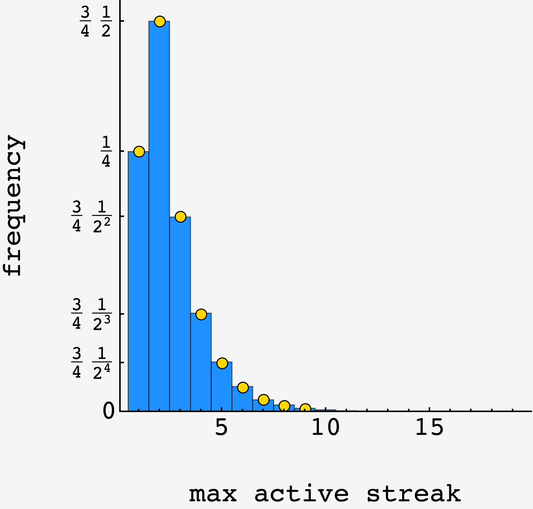 \[\begin{align} W &= \frac12\cdot 0 + \frac12\cdot(1 + W) \\ &= 1. \end{align}\]So, the expected maximum active streak is