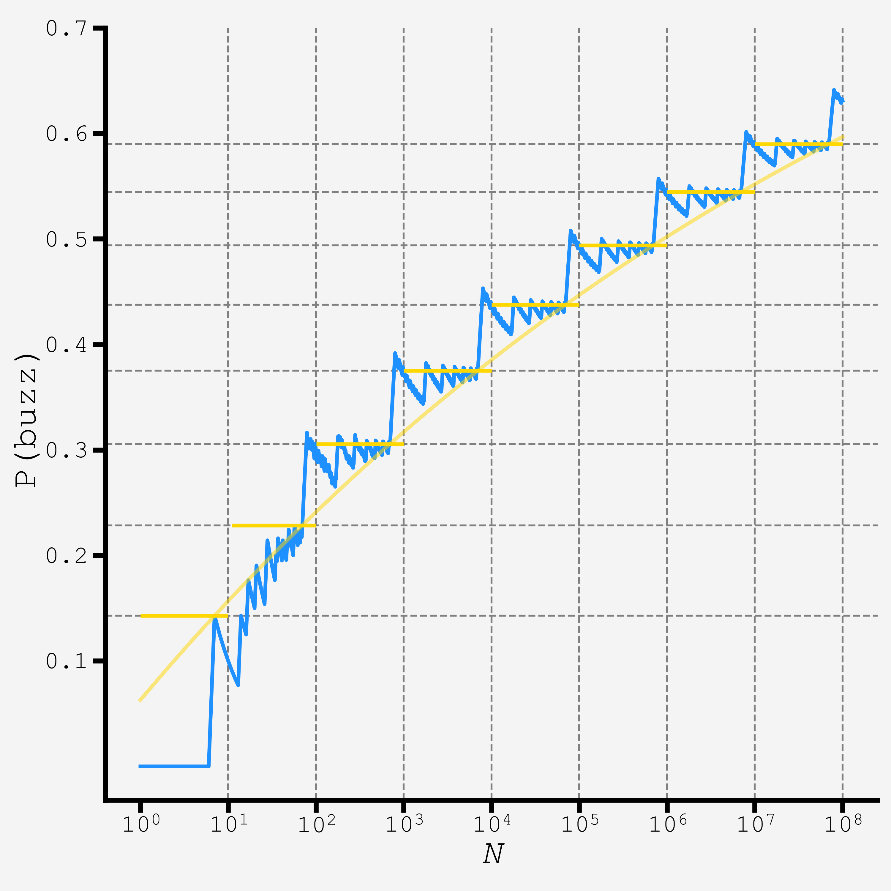 \[\begin{align} P_\text{buzz}(N) &= P_\text{div by 7} + P_\text{has 7} - P_\text{div by 7} \times P_\text{has 7} \\ &= \frac17 + \frac67\left[1-\left(\frac{9}{10}\right)^{N-1}\right] \end{align}\]Up to the $N^\text{th}$ order of magnitude $10^N$ we have included all possible $N$ digit numbers in our sample. Until we hit the next leading $7$ at $7\times 10^N,$ each additional $10^N$ numbers we consider will, asymptotically, have the same buzz statistics as the numbers up to $10^N$ since they don’t have a leading $7.$ This means that the cumulative fraction of buzz numbers will be the same at $\{10^N, 2\times 10^N, \ldots, 6\times 10^N\}.$